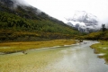 从园区门口骑马到冲古寺有5公里多,沿途都是上山道,但还比较宽,骑马在这林中到上走也别有一番风味因为是雨夹雪的天气,骑马上去后,手脚都冻木了;到了冲古寺下马,我徒步1.7公里到园区电瓶车站,坐80元的电瓶车到珞绒牛场,珞绒牛场三面雪山环绕(北峰观世音菩萨仙乃日(海拔6023米),南峰文殊菩萨央迈勇(海拔5958米),东峰金刚手菩萨夏洛多吉(海拔5958米)),是一处天然的高山牧场和草地,这里是进入牛奶海与五色海的必经之地,由于体力和时间(下午3点要回稻城),我没有进牛奶海和五色海(进去来回要6小时),我在这里拍了一些高山草地风光、深秋河床,这些河床的白色粉末,像雪一样,我开始认为是打霜了,到跟前一看才知是一些白色的沉淀物,成分不知道;在牛场,我一直沿山路向前,越靠近雪山。路越难走,草地上一踩,水往上冒,泥水深一脚,浅一脚;我只好回来,在牛场的休息处,碰到通行的莉莉,等一下又遇上老胡等二人,大家一起坐电瓶车回到冲古寺。